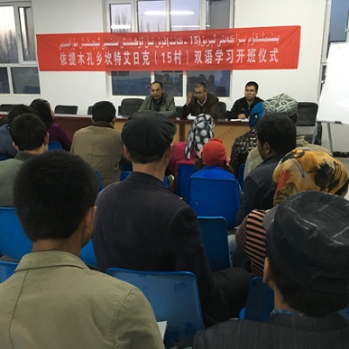 又有双语夜校开班了。 培养村干部的双语能力是打造永不走的工作队,建设“五好支部”的重要举措。住坎特艾日克(15)村工作组3月22日举行了双语学习班开班仪式,工作组组长艾尼瓦尔•塔依尔、副组长库力亚•库力什、工作组成员卡力比登•力提甫和村党支部副书记阿布力米提•沙迪尔参加了开班仪式。