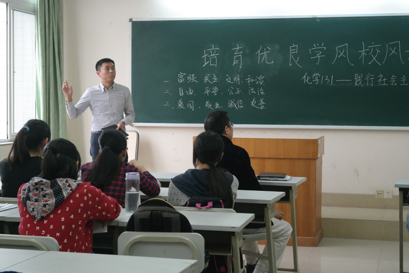 主题班会主要围绕“社会主义核心价值观”“优良学风班建设”“时间都去哪儿了”为具体内容,通过讨论会、专题课、观看视频谈感受等广大同学喜闻乐见的形式开展。院长苏育志等教师党员参与了班会讨论,认真倾听同学们的见解,并而对同学们提出的疑惑,都耐心解答,从国家,社会,公民三个层面逐一讲解社会主义核心价值观二十四字的深刻内涵,他们强调,同学们需要主动加强自我修养,不断提高自身素质,注重学风班风校风的建设,争做文明守纪好学生,并号召大家身体力行,用实际行动来为浪live
