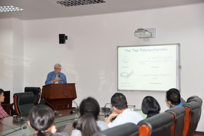 Peter Butko教授的讲座内容涉及到渗透压原理、亲水作用、化学势、自由能等化学学科基础概念,讲解了如何利用渗透压原理推导出水分子与大分子之间的相互作用大小,并推导出某种生物酶由于受到水分子与受体的竞争作用,在水环境下活性会降低的结论。接着,教授表示欢迎我校学生报读名古屋大学,并介绍了该校的情况:名古屋大学是日本七所名牌国立大学之一,其专业包括文学、教育学、法学、医学、理学和工学等,其中尤为著名的是理学、工学专业,日本13名诺贝尔得奖者中,有6人出自该校,包括4名物理学奖得奖者和2名化学奖得奖者。