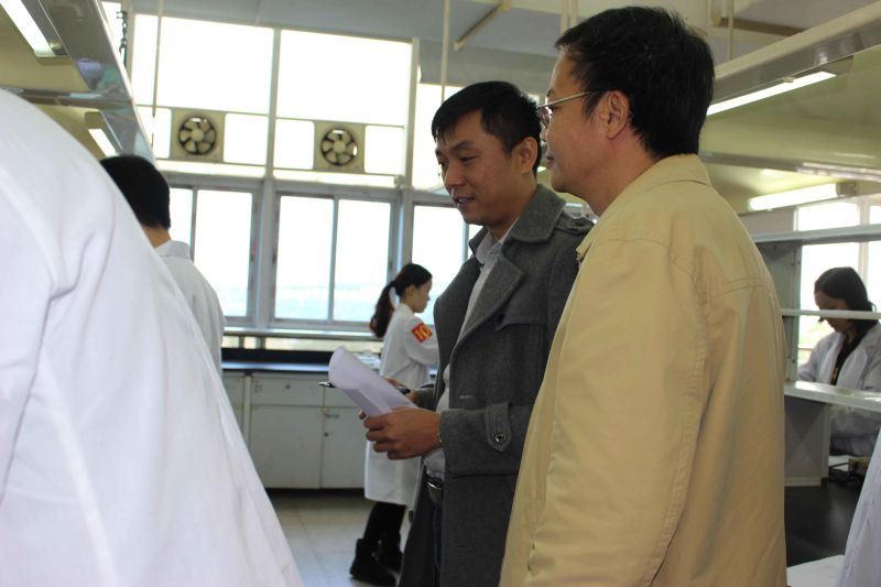 党委副书记谭启亮同志亲临大赛现场,察看比赛进行的同时并对参赛选手认真的态度和扎实的实验技能表示肯定。
