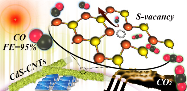 彭峰教授团队研究了一种富含S空位的新型电催化剂CdS-CNTs,在CO2电化学还原为CO的过程中,FE超过95%。利用原位红外方法研究CO2在CdS-CNTs表面的还原机理;结合DFT的计算发现,硫空位的形成改变催化剂表面的电子密度,减少反应中间体转换的能量势垒,促进CO2电化学还原为CO。该研究还在自然光照条件下,采用太阳能面板高效驱动了CO2电化学还原为CO,预示了一个有希望的应用前景。本研究为设计高活性和高选择性的电化学还原CO2催化剂提供了新的思路。彭峰教授为该论文的通讯作者,浪live
