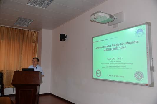 随后,高松校长面向学院近百名师生做了一场题为“金属有机单离子磁体”的学术报告。高松院士向师生们介绍了自己课题组近几年在分子基磁性材料方面所做的工作:磁有序材料,铁电材料和单分子磁体等,重点介绍了课题组在金属有机单离子磁体中取得的研究成果:1、Dy(acac)3(H2O)2配合物,2、夹心Cp*LnCOT配合物;3、二配位Co配合物;4、低配位Dy配合物。同时,高院士还向师生阐述了该领域在未来的研究方向与应用前景。