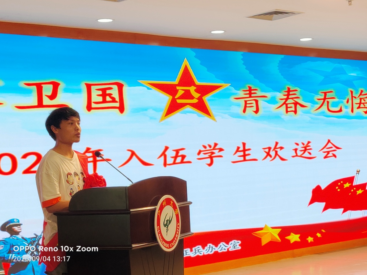 9月4日,学校举行2020年夏秋季入伍学生欢送会,来自全校16个学院和4个二级学院的70名同学,带着学校领导的殷殷嘱托,带着同学们的深深祝福,应征入伍,保家卫国。其中就有我院的两名毕业生:刘丽强和张娅玉。刘丽强同学还代表全体入伍学生在欢送会上发言。