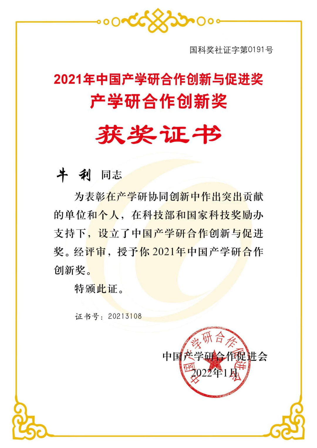 按照《国家科学技术奖励条例》和《中国产学研合作促进会产学研合作创新与促进奖评审办法》,中国产学研合作促进会产学研合作创新与促进奖奖励委员会组织专家评审并公示:我院牛利老师荣获2021年产学研合作创新奖(个人)、浪live