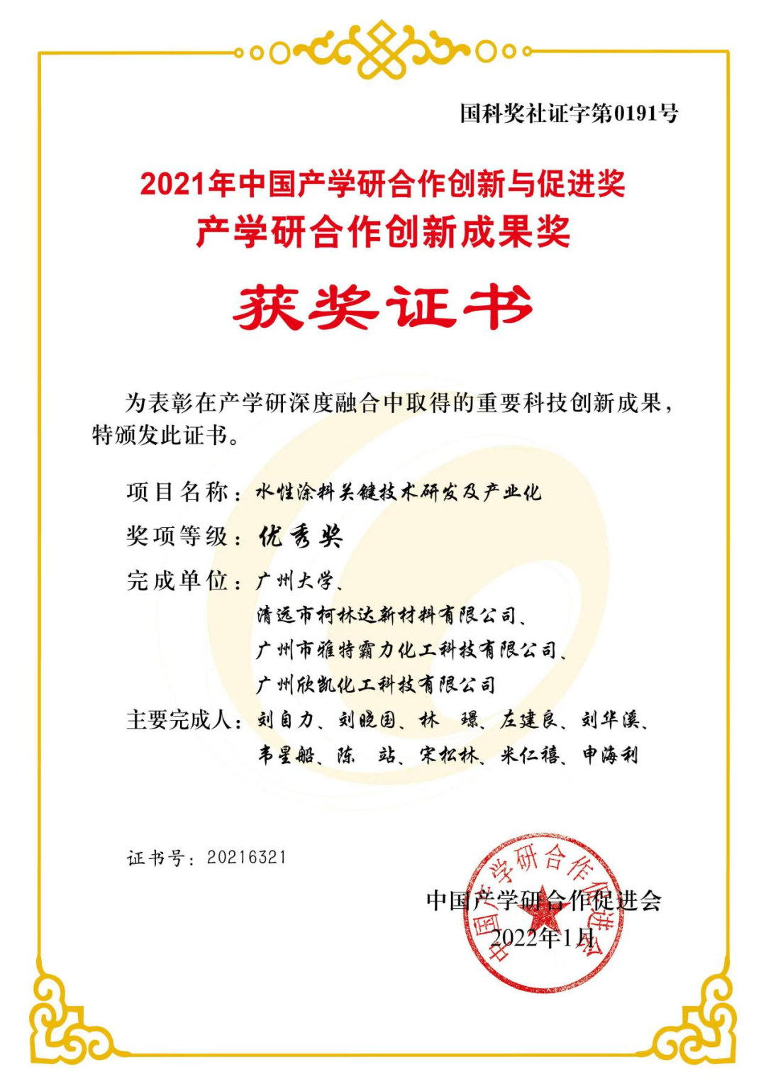 申报的“水性涂料关键技术研发及产业化”项目(主要完成人:刘自力、刘晓国、林璟、左建良、刘华溪、韦星船、陈站、宋松林、米仁禧、申海利)荣获2021年产学研合作创新成果优秀奖。