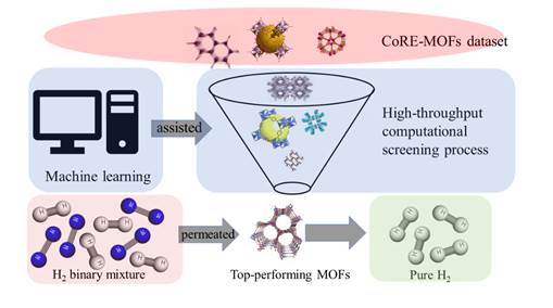 氢气是一种清洁、高效、可替代化石燃料的能源。金属-有机骨架膜(MOFM)由于其高比表面积、孔隙率、可调控的孔道环境,在气体分离领域表现出巨大潜力。然而MOF的组装方式决定了MOF的种类繁多,用实验方法一一测试MOFM的氢气分离性能是耗时费力的。