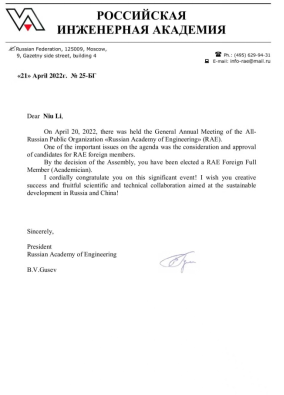 4 月22日,俄罗斯工程院院长B.V.Gusev向我院牛利教授发来贺信,祝贺他当选俄罗斯工程院外籍院士,并希望他为中俄两国的持续发展开展创造性和富有成效的科学和技术合作。该届新当选院士由俄罗斯工程院中国中心于2021年统一推荐,俄罗斯工程院按照程序进行评选,由于疫情影响延至今年4月召开本次年会。这是历年来华人专家当选最多的一次,也是中俄两国建立新时代全面战略协作伙伴关系、共同举办中俄科技创新年活动结出的又一硕果。