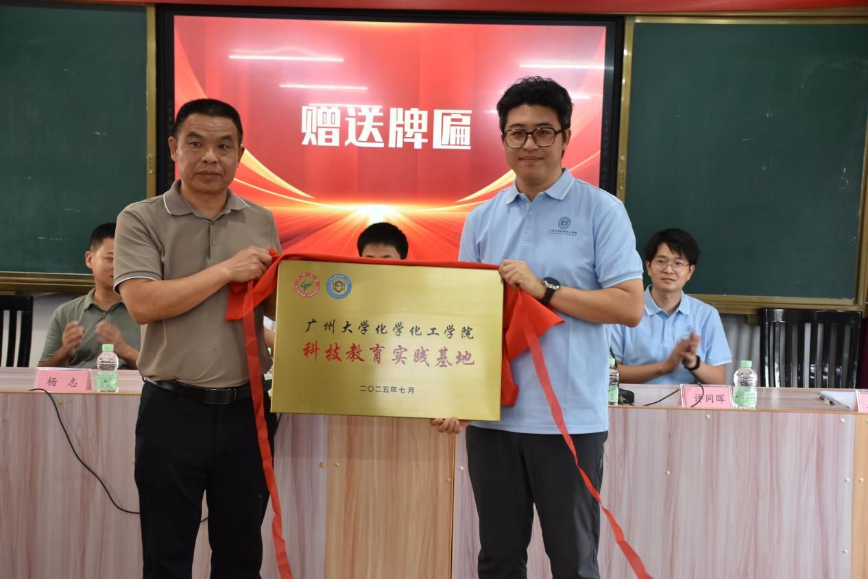 (图为突击队向平远县田家炳中学赠予“科技教育实践基地”牌匾)